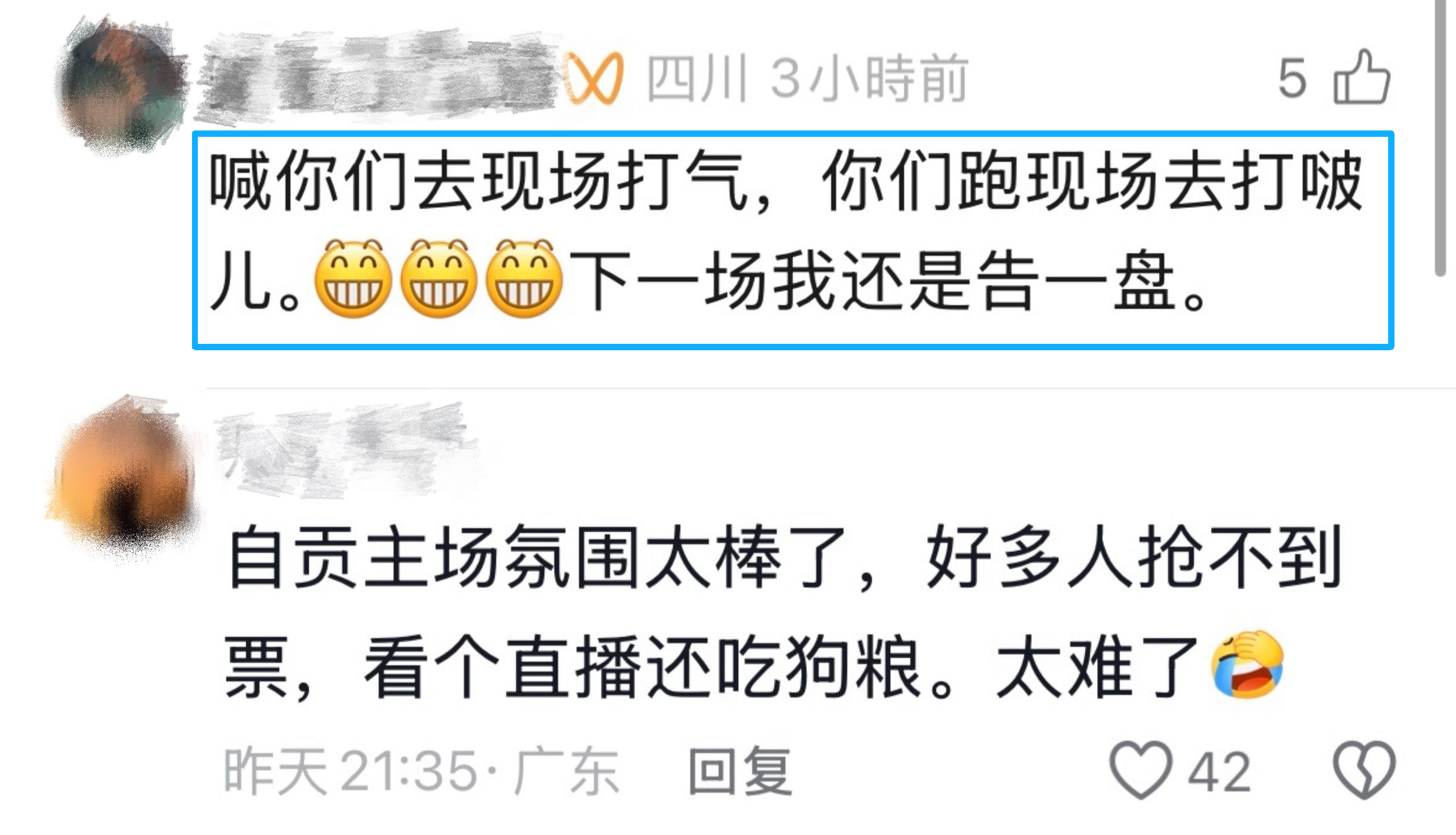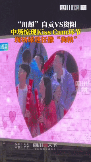 赛场上的欢乐也延续到了观众席。自贡与资阳的比赛中场,突如其来的“KissCam”环节更是撒出一把“川超牌狗粮”,现场大屏镜头拍下了情侣们的kiss画面,疯狂撒狗粮。网友热评