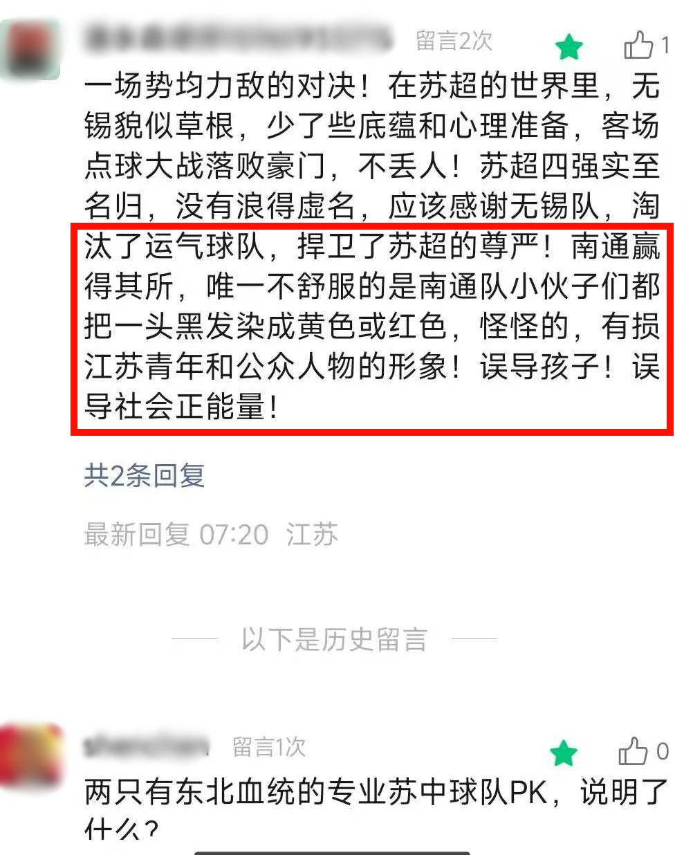 而有的球迷在称赞“南通(半决赛)赢得其所”的同时也指出“唯一不舒服的是南通队小伙子们都把一头黑发染成黄色或红色,怪怪的,有损江苏青年和公众人物的形象!误导孩子!误导社会正能量!”