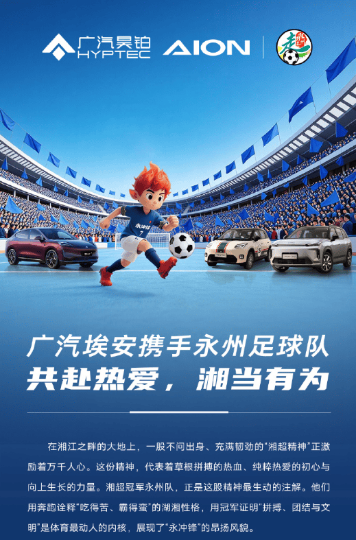 广汽埃安官宣成为 2025 年湘超冠军球队永州足球队的 2026 年官方战略合作伙伴。双方将继续围绕 国民好车致敬场上冠军 的理念,深化在足球赛事推广、品牌联动与球迷互动等多方面的合作,共同推动地方体育文化与新能源汽车品牌的融合发展。
