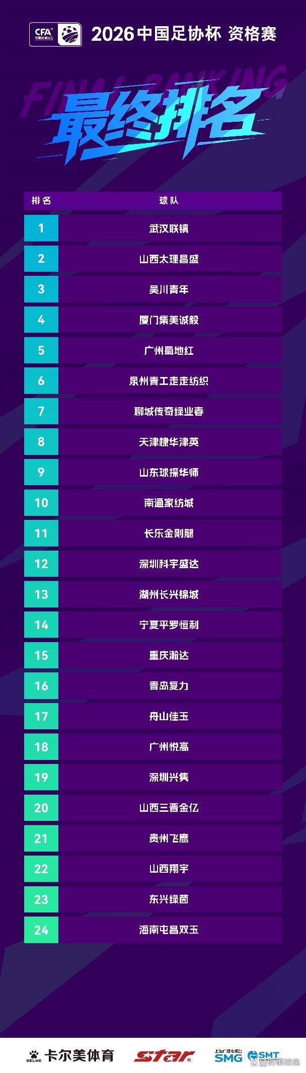 回顾赛程,2026足协杯正赛首轮将于明年3月13日至15日拉开战幕,历经八轮激烈对抗,最终决出年度冠军。正赛首轮共有32支队伍参与角逐,其中包括通过资格赛脱颖而出的12支业余劲旅,他们分别是武汉联镇、山西太理昌盛、吴川青年、厦门集美诚毅、广州蜀地红、泉州青工走走纺织、聊城传奇绿业春、天津棣华津英、山东球探华师、南通家纺城、长乐金刚腿以及深圳科宇盛达。除此之外,还有19支来自2026赛季中乙联赛的球队,值得注意的是,成都蓉城B队、山东泰山B队、上海海港B队、武汉三镇B队和大连英博B队这五支位于中乙的中超B队将不会参赛。另外还有一支队伍,预计将是2025年中冠联赛的优胜者,亦或是中国足协特邀的神秘之师。