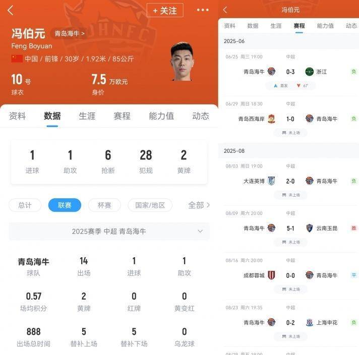 在中超赛场上,冯伯元本赛季出场14次,仅贡献1球1助攻,表现平平。自从外援兰克尔泽加盟后,他更是连替补席都难以进入,连续六轮比赛未能获得出场机会。或许是为了找回比赛状态,他选择了参加苏超联赛,但事与愿违,这次“降维打击”却演变成了一场“翻车现场”。本赛季他的中超场均评分仅为6.2分,在队内名列倒数。转会市场的数据更是无情地显示,他的身价已经从巅峰时期的50万欧元跌至不足10万欧元。