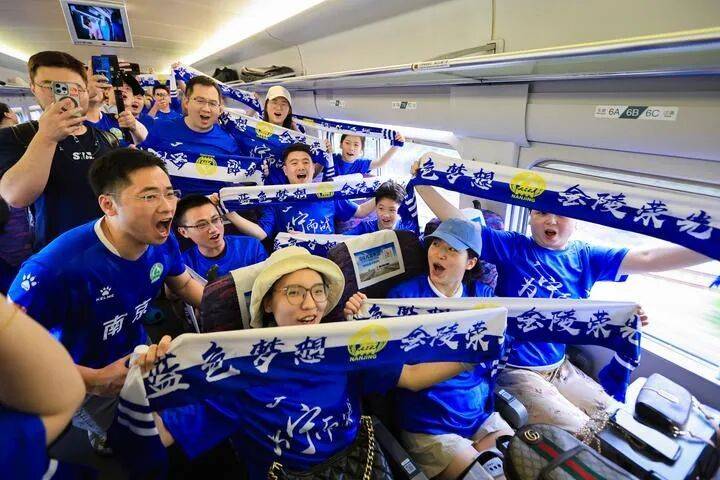 铁路部门开行南京站往返淮安东站的长三角首趟“苏超”球迷高铁专列。新华社发(苏阳 摄)